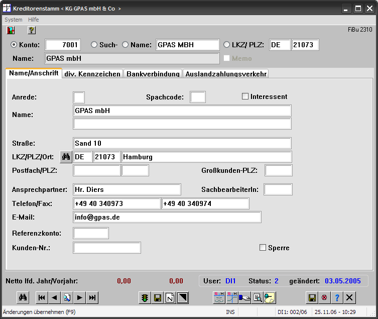 Alle Änderungen erfolgen im Dialog und werden protokolliert. Der Zugriff auf Stammdaten erfolgt programm-, funktions- und satzweise je MitarbeiterIn. An Funktionen stehen Anzeigen, Neuanlage, Änderungsdienst und In- bzw. Reaktivieren zur Verfügung. Satzweise werden die Daten gegen einen Informationscode der MitarbeiterInnen geprüft, so daß bestimmte Einblicke geschützt werden können. Generell werden Stammsätze nicht sofort physisch gelöscht, sondern zunächst inaktiviert. Via separatem Programm werden sie dann physisch gel&oouml;scht.