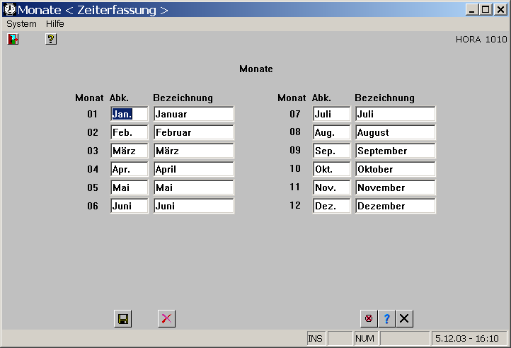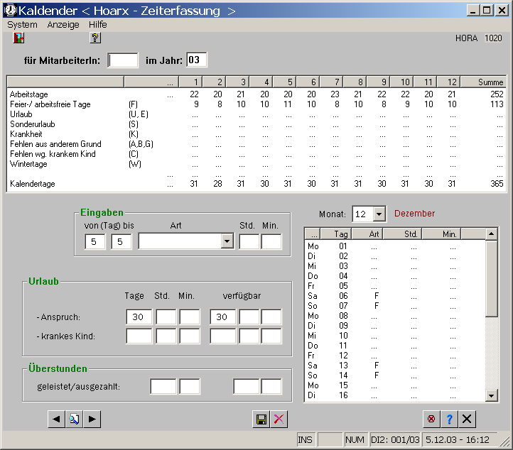Für jede(n) Mitarbeiter(In) wird ein Jahreskalender angelegt, in dem Urlaubszeiten, Fehlzeiten etc. eingetragen sind. Im oberen Teil ist die Übersicht des Jahres, im unteren Teil die Details eines jeden Monats eingeblendet.