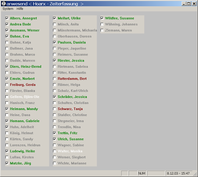 Das Programm "Anwesende" gibt einen Überblick über die An- bzw. Abwesenheit der MitarbeiterInnen.