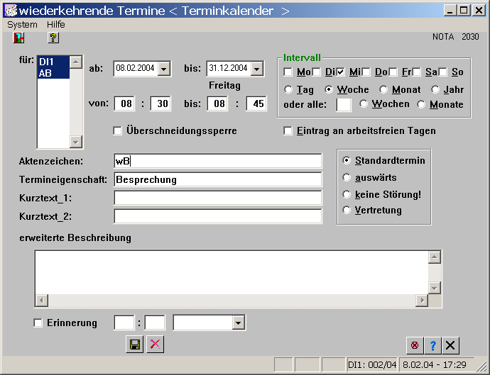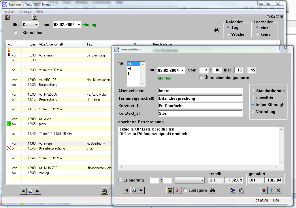 Termindetails zu einem vorhandenen Termin werden durch einen Doppelklick auf den Termin (hier: 14:00 Uhr) eingespielt.
