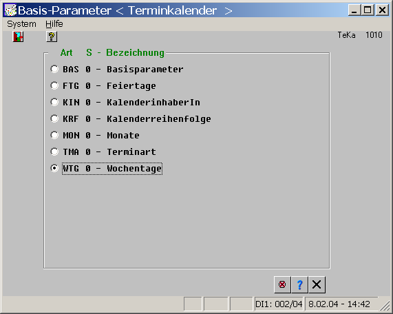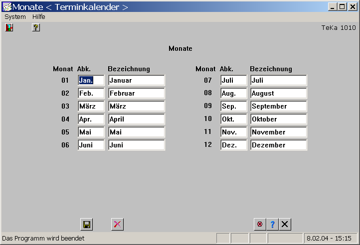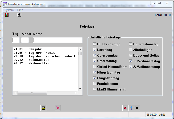 Jahreskalendermuss je Kalenderjahr einmal vorliegen. Es werden die Wochentage, die Wochen und die veränderlichen christlichen Feiertage (Ostern) ermittelt und für jedes Jahr gespeichert.