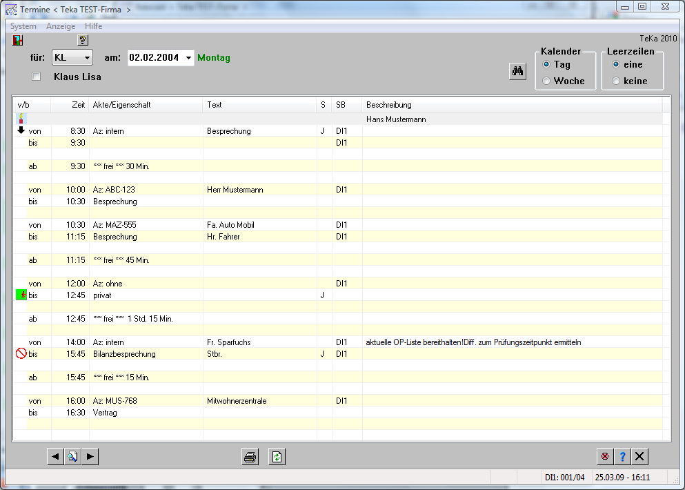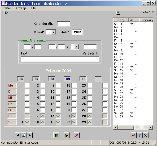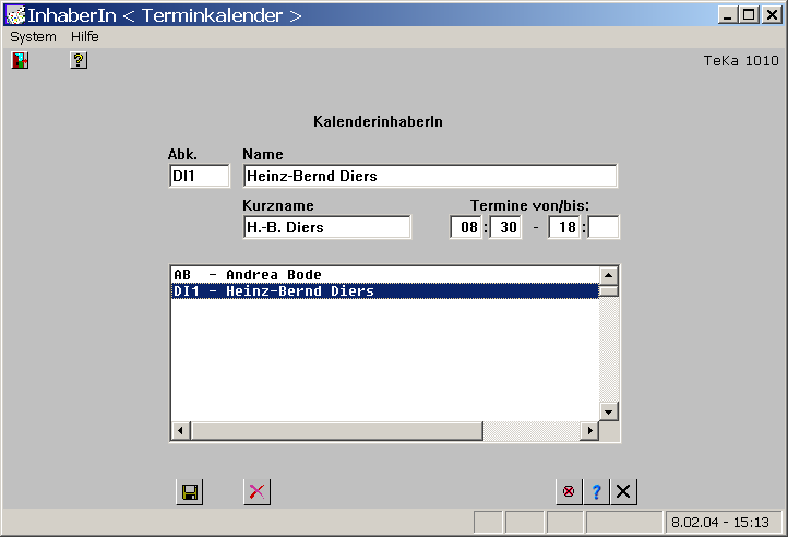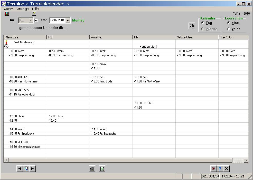 Ebenso einfach kann ein einzelner Termin bzw. ein Termin für alle oder mehrere Personen eingetragen, geändert oder gelöscht werden. Der Ausdruck des Kalenders erfolgt auf Knopfdruck.